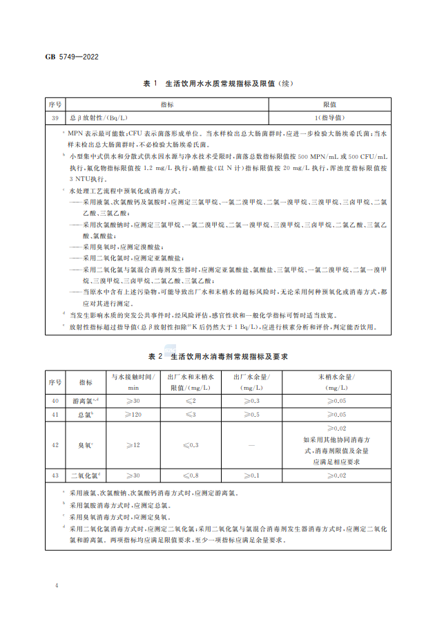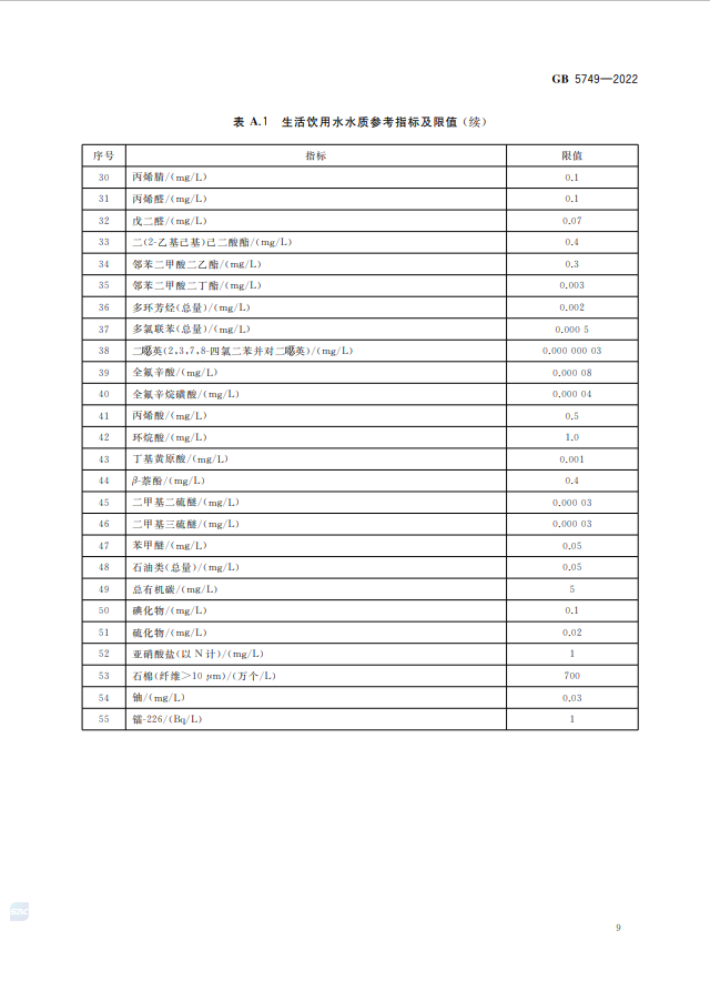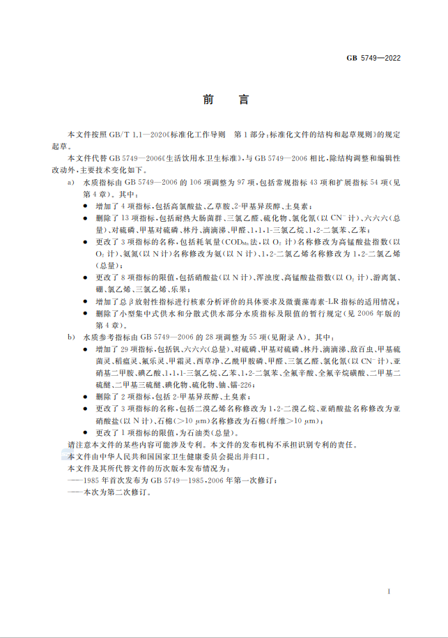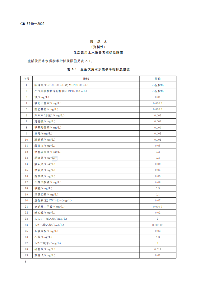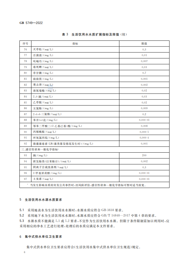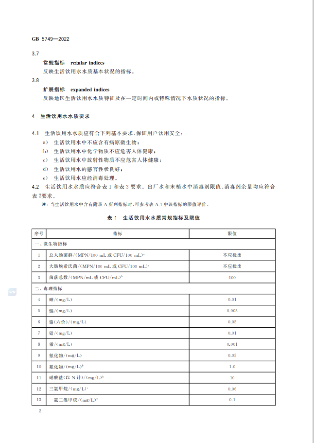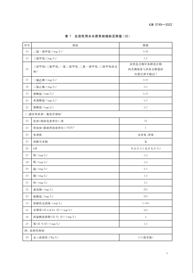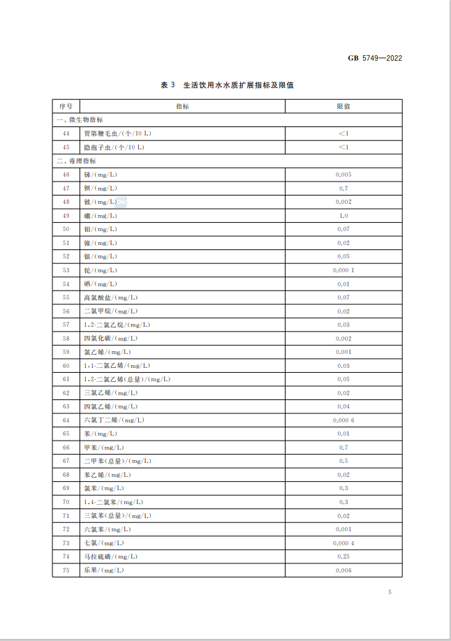 生活飲用水衛生標準的修訂是一項持續進行的工作,為了適應科技發展和保障公眾健康,標準的修訂可能會涉及多個方面的變化,例如更新的水質參考指標、新的水污染物的納入以及更加嚴格的健康限值等 。生活飲用水衛生標準GB5749-2022代替GB5749-2006,究竟改了什么? 1、水質指標變化 水質指標由GB5749-2006的106項調整為97項,包括常規指標43項和擴展指標 54 項。其中,增加了高氯酸鹽、乙草胺、2-甲基異莰醇和土臭素4項指標;刪除了耐熱大腸菌群、三氯乙醛、硫化物、氯化氰(以CN-計)、六六六(總量)、對硫磷、甲基對硫磷、林丹、滴滴涕、甲醛、1,1,1- 三氯乙烷、1,2-二氯苯和乙苯13項指標。 2、水質指標名稱變化 耗氧量(CODMn法,以O2計)名稱修改為高錳酸鹽指數(以O2計);氨氮(以N計)名稱修改為氨(以N計);1,2-二氯乙烯名稱修改為1,2-二氯乙烯(總量)。 3、水質指標限值變化 修改了硝酸鹽(以N計)、渾濁度、高錳酸鹽指數(以O2計)、游離氯、硼、氯乙烯、三氯乙烯、樂果8項指標限值。 免責聲明:本網站標準資料僅供參考,使用標準請以正式出版的標準版本為準。 生活飲用水衛生標準GB5749-2022全文如下: