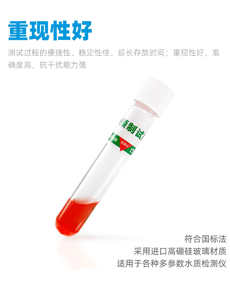 測(cè)試過程的便捷性、穩(wěn)定性佳,延長(zhǎng)存放時(shí)間;重現(xiàn)性好,準(zhǔn)確度高,抗干擾能力強(qiáng),采用進(jìn)口高硼硅玻璃材質(zhì)適用于各種多參數(shù)水質(zhì)檢測(cè)儀,作為綠色試劑,減少接觸化學(xué)危險(xiǎn)品的機(jī)會(huì),確保操作人員的身體健康