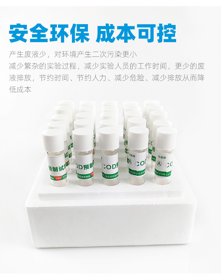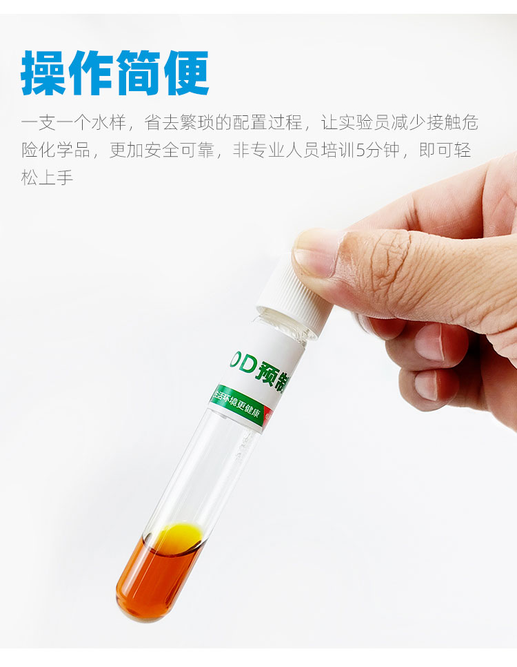 一支一個(gè)水樣,省去繁瑣的配置過程,讓實(shí)驗(yàn)員減少接觸危險(xiǎn)化學(xué)品,更加安全可靠,非專業(yè)人員培訓(xùn)5分鐘,即可輕松上手
