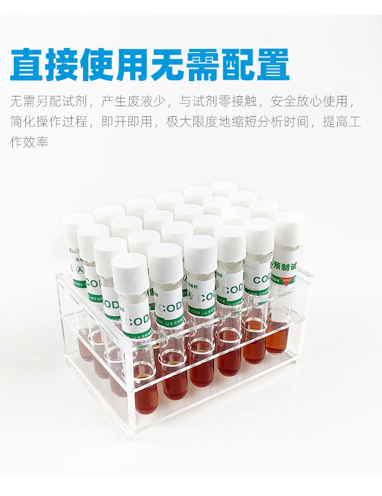 無需另配試劑,產(chǎn)生廢液少,與試劑零接觸,安全放心使用,簡(jiǎn)化操作過程,即開即用,極大限度地縮短分析時(shí)間,提高工作效率