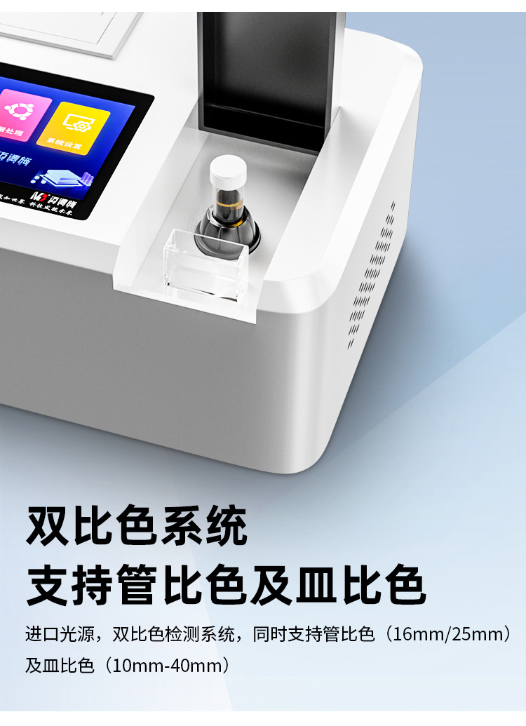 8、雙比色檢測(cè)系統(tǒng),同時(shí)支持管比色(16mm、25mm)及皿比色(10mm-40mm)。