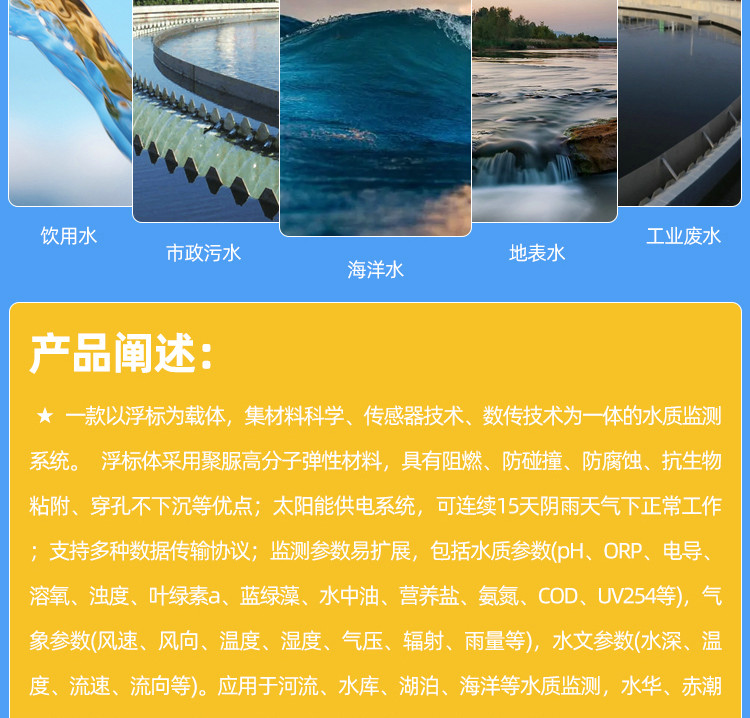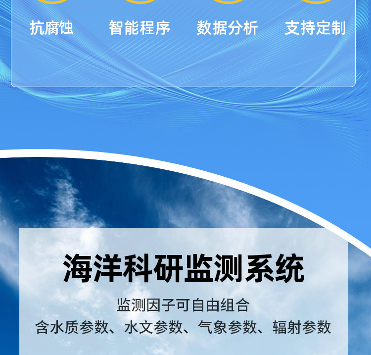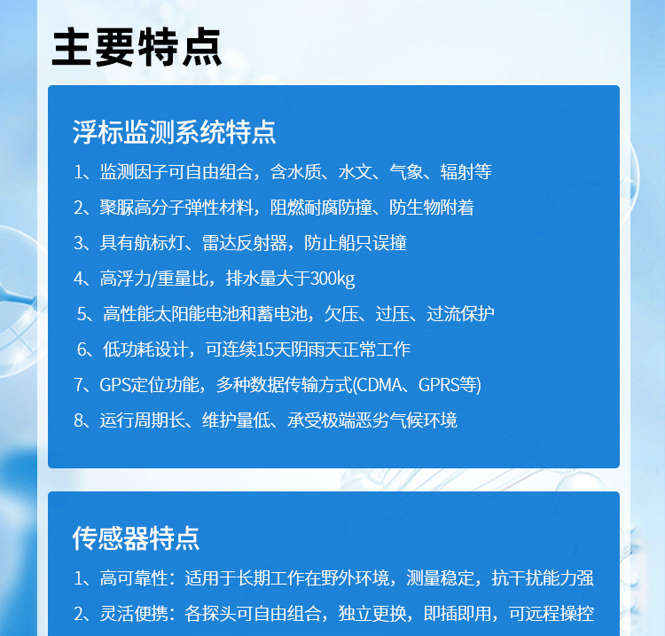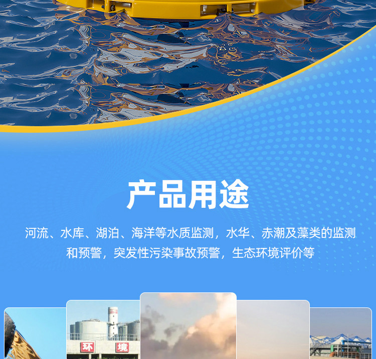 海洋浮標水質監測站可應用于海洋(河流、水庫、湖泊等)水質監測,水華、赤潮及藻類的監測和預警,突發性污染事故預警,生態環境評價等。