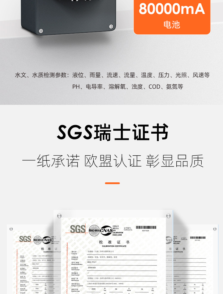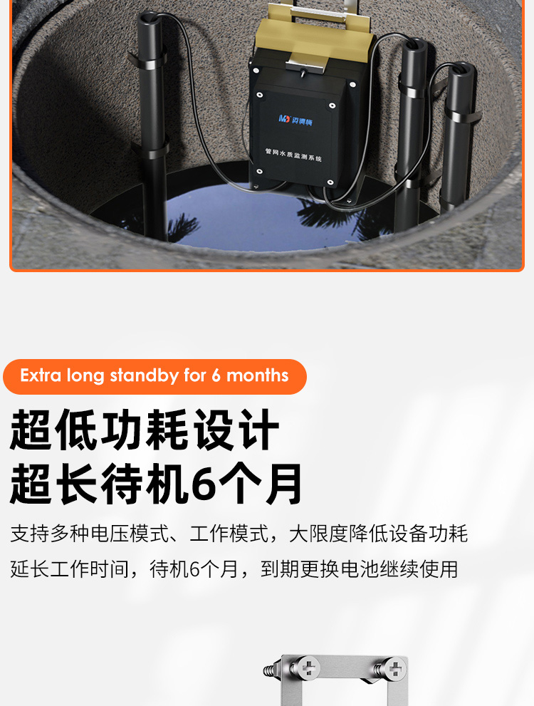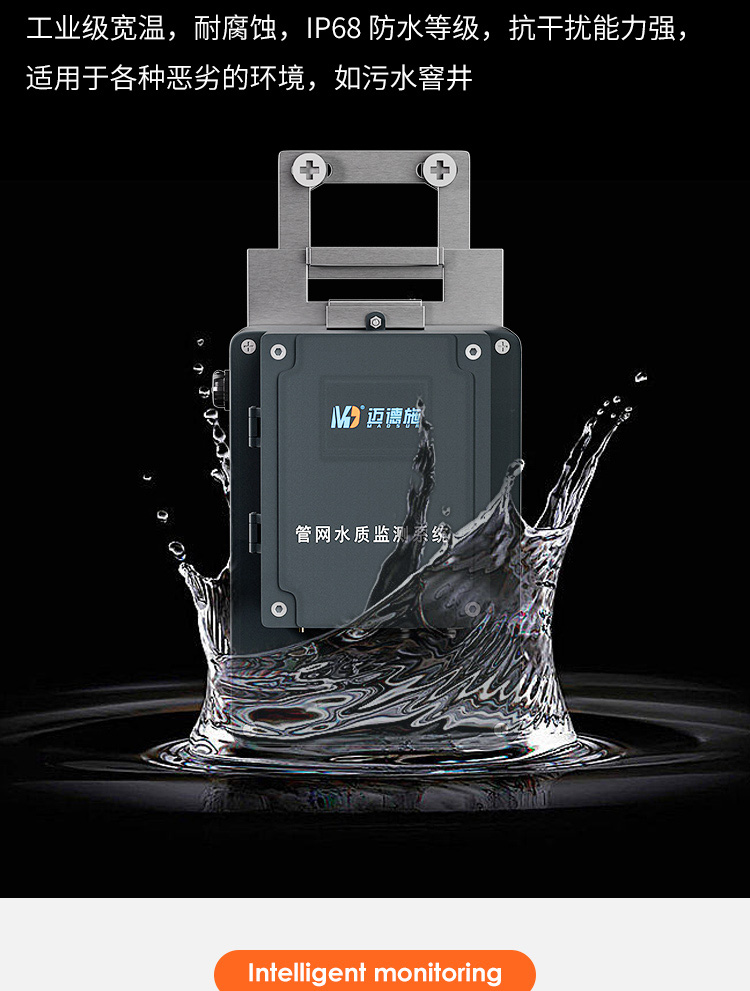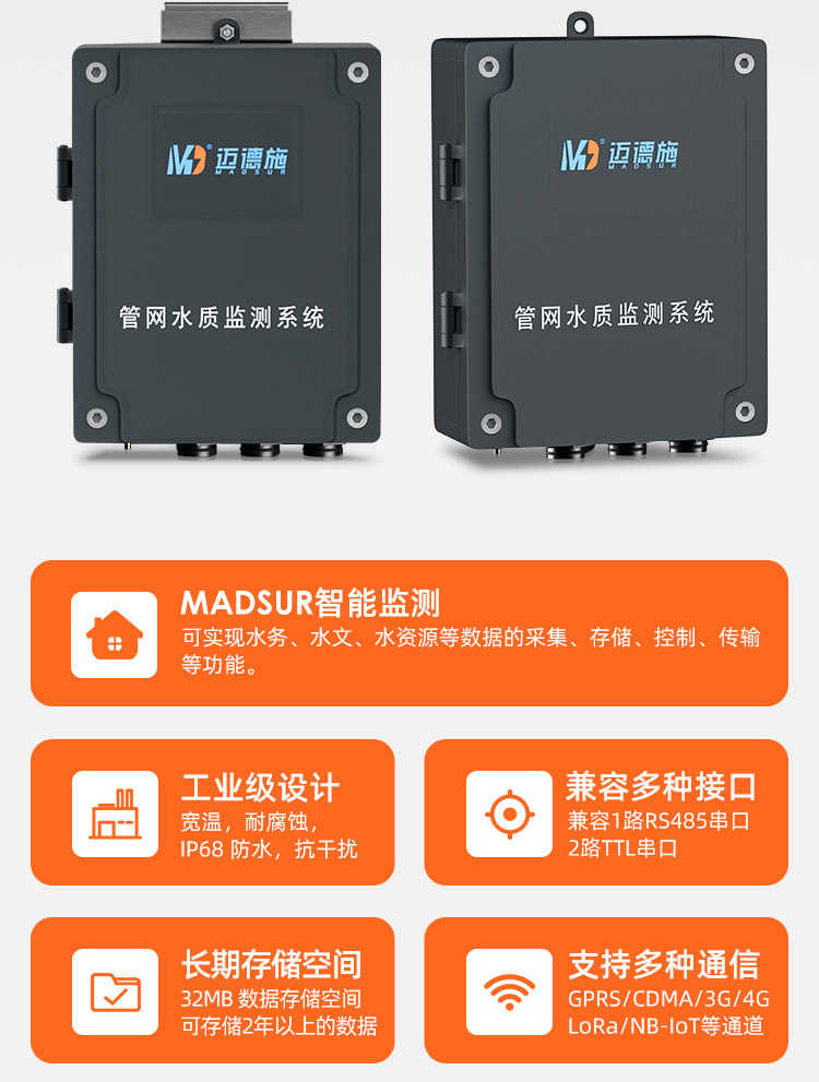MDS-GW100地下管網水質監測系統,集監測電極、供電電源、數據傳輸、系統控制于一體,便于客戶使用安裝維護。監測電極可自由組合PH、電導率、溶解氧、濁度、COD、氨氮、葉綠素、藍綠藻、水中油等多個因子。內置高容量鋰電池,給監測電極、控制系統、數據傳輸模塊供電,采用節能模式電池可用6個月時間。數據傳輸模塊可選4G、CDMA、BD等方式,上傳至指定平臺。控制模塊可設置節能模式,可設置、校準電極。