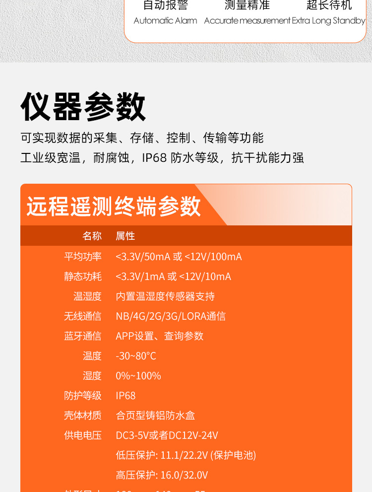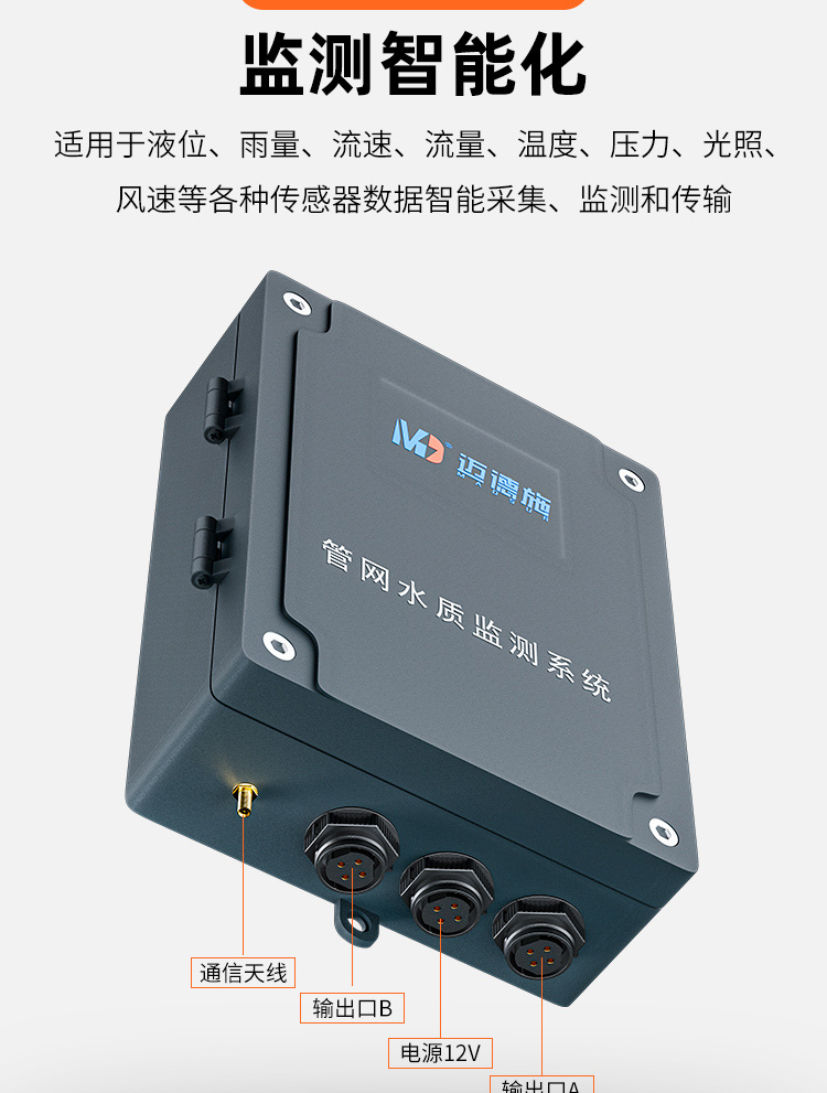 適用于液位、雨量、流速、流量、溫度、壓力、光照、風速等各種傳感器數據智能采集、監測和傳輸。