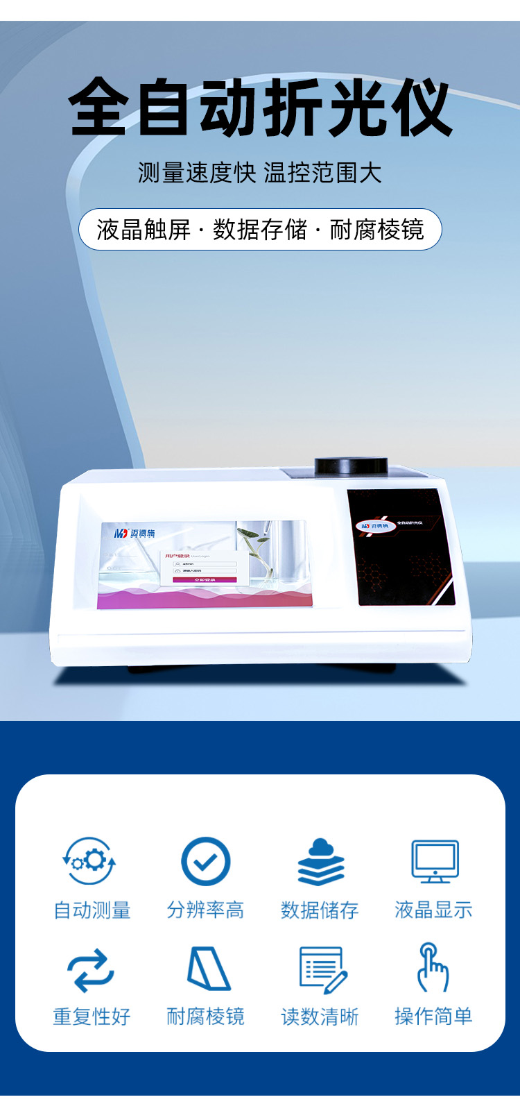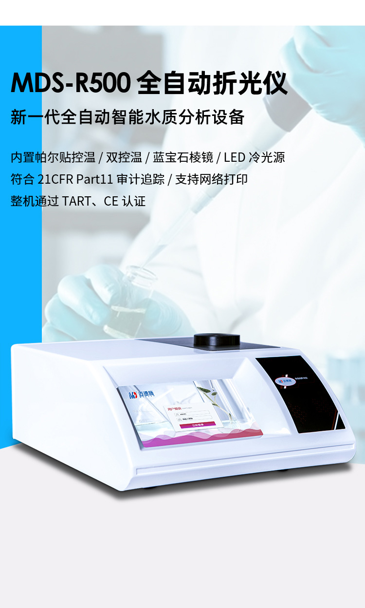 MDS-R500全自動折光儀是邁德施生產制造的一種主要用于測量物質折射率的專業實驗室儀器儀表。全自動折射儀配備高性能線陣 CCD 感光部件,通過高速、高精度的信號采集和分析處理技術,配有半導體帕爾貼超級溫度控制系統。能高效、高精確測量透明、半透明、深色、粘稠狀等各類液體的折射率(nD)和糖溶液的質量分數(錘度 Brix)。